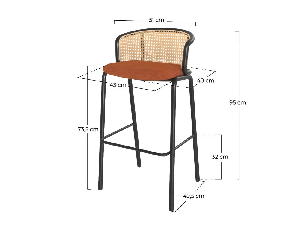 Si vous avez envie de design unique, la chaise de bar brique Timka 73,5 cm (lot de 2) est faite pour vous. Le point fort de ce modèle repose sur une esthétique originale et percutante. Un délicat cannage se mêle ici à une structure en métal noir et une assise en tissu au coloris chaud. Très bohème, elle va booster un coin repas, dans une pièce à vivre ou une cuisine. Autour d’un îlot central ou un mange-debout, ce duo élégant va vraiment faire sensation.