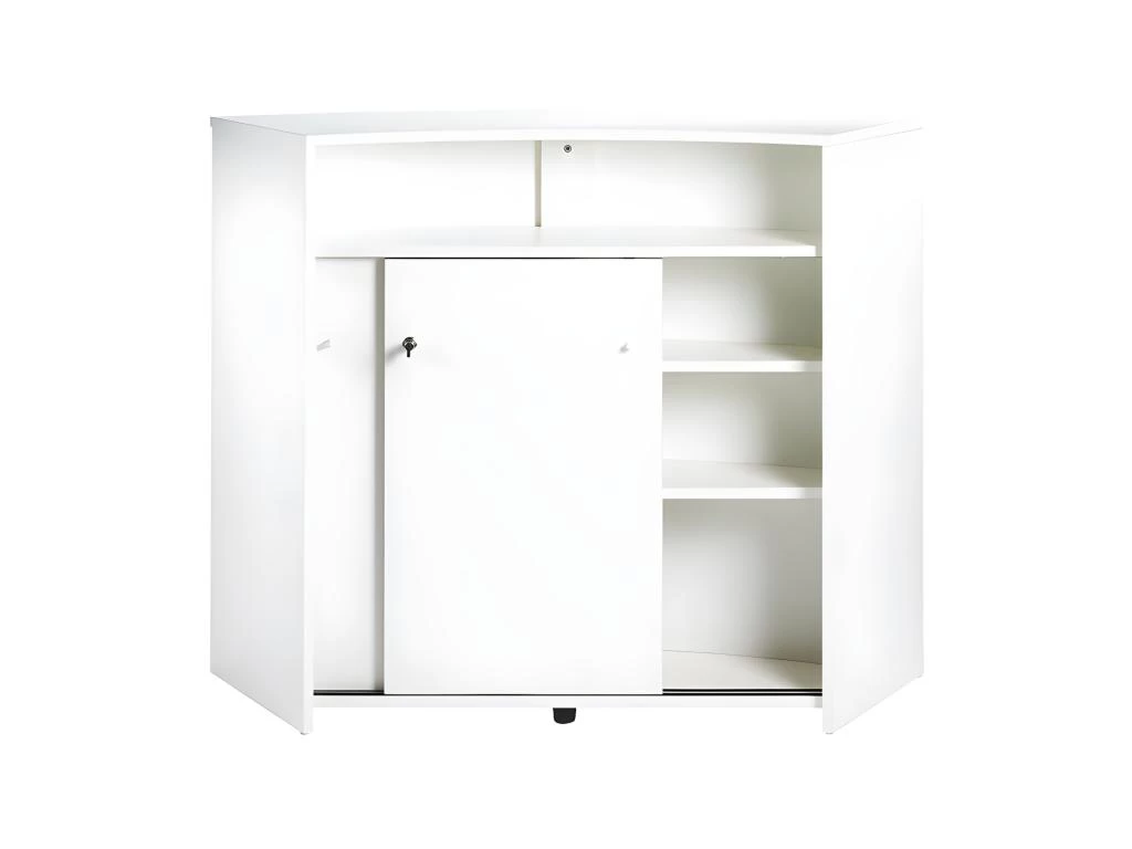 Le revers du meuble offre une grande niche ouverte et un espace de rangement accessible par 2 portes coulissantes munies d’une fermeture à clef, 3 niveaux de pose sont disponibles à l’intérieur