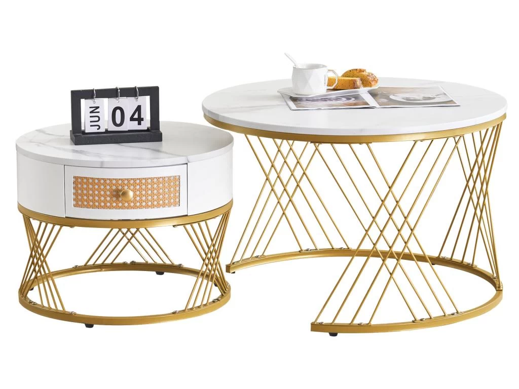 Style élégant : la petite table est dotée d’élégants tiroirs en rotin en plastique décorés de poignées rondes dorées. Les deux plateaux de table sont en PVC mat avec un aspect marbre et sont soutenus par un élégant cadre en fer doré.