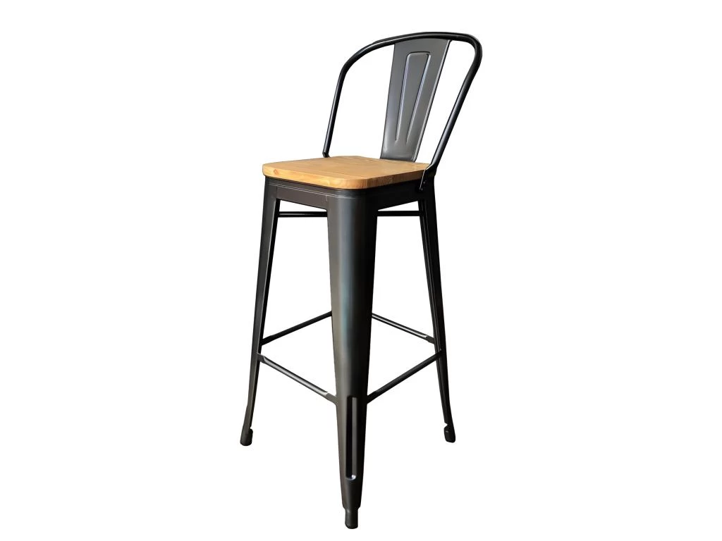 Le Plateau de la table ainsi que les assises des chaises sont réalisés avec le même bois, ils sont en Orme massif clair et forment ainsi un bel ensemble. La structure de la table est en acier gris-bronze, le piètement des tabourets est en acier gris anthracite, ces 2 teintes légèrement différentes s’accordent parfaitement. Le nouveau design de la chaise haute est représenté sur le 4 eme visuel.