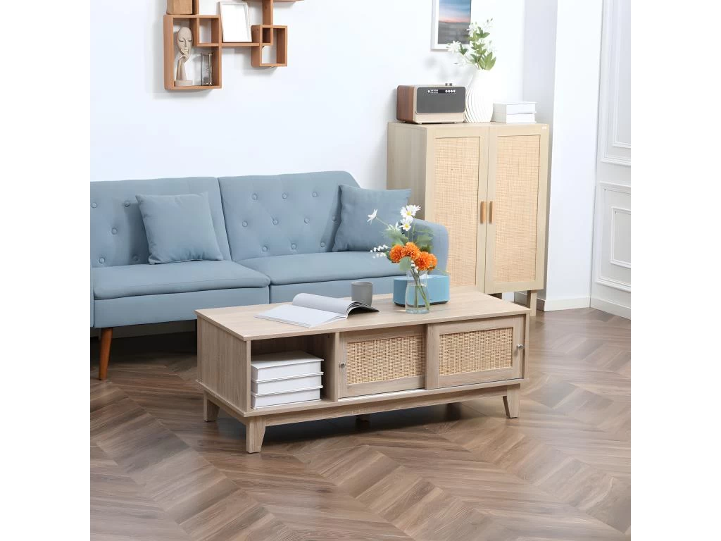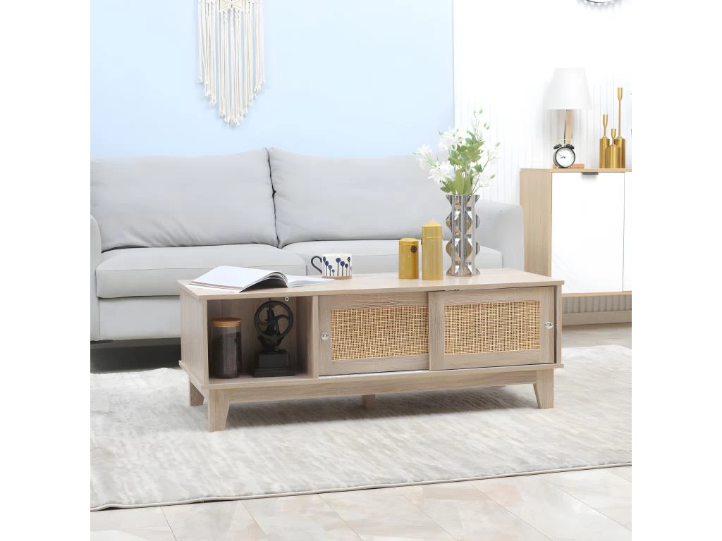 – Table basse style bohème chic naturel avec façades de portes en cannage de rotin idéal pour ajouter une touche supplémentaire d’élégance à votre intérieur