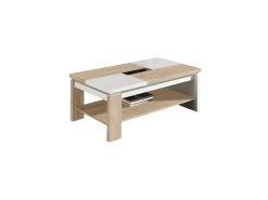 Superbe table de salon contemporaine, bois blanc, bois clair et verre noir avec plateau relevable.