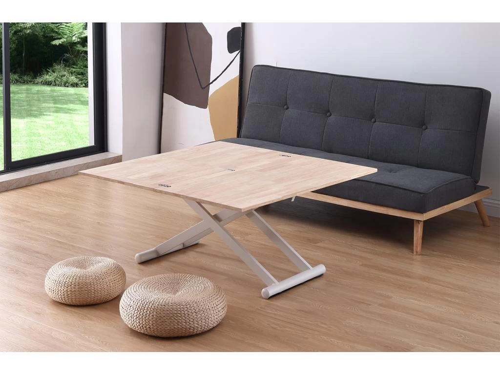 Table basse élévatrice transformable en table à manger avec plateau extensible en bois de chêne.