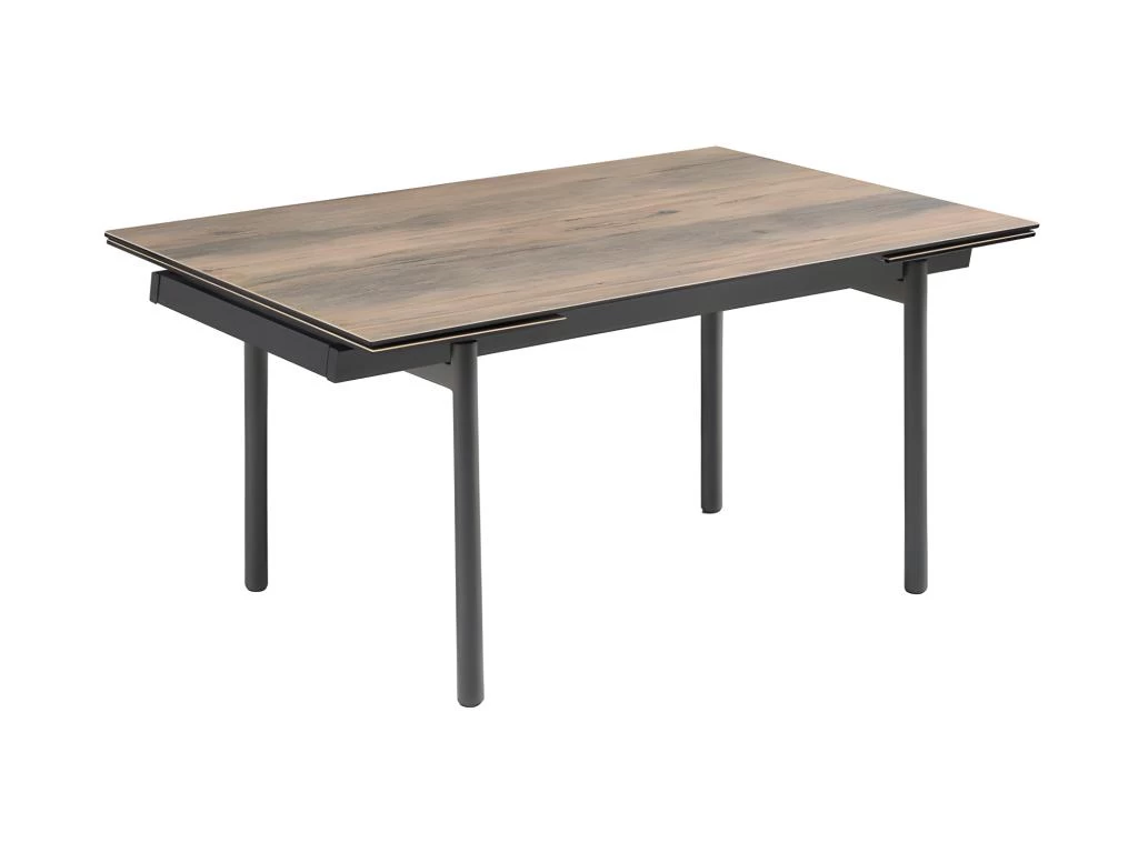 La table personnalisée adaptée à vos envies ! Son plateau en céramique Italienne de 3mm au décor bois vieilli marron finition mate est original. Attablez jusqu’à 10 personnes grâce à ses 2 rallonges intégrées de 40 cm chacune, pratiques, et simple d’utilisation. Elle passe ainsi de 160 à 240 cm. Son plateau en céramique lui confère des qualités remarquables : résistance aux rayures, insensible aux taches diverses, et ne craint pas les différences de températures. Ses 4 pieds droits en métal noir vous assurent stabilité et finesse !