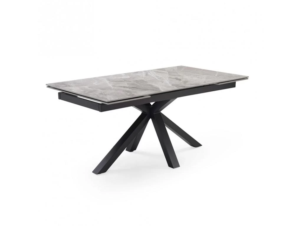 La table personnalisée adaptée à vos envies ! Son plateau en céramique Italienne pleine masse de 11mm gris marbré brillant est lumineux et robuste. Attablez jusqu’à 10 personnes grâce à ses 2 rallonges intégrées de 40 cm chacune, pratiques, et simple d’utilisation. Elle passe ainsi de 160 à 240 cm. Son plateau en céramique lui confère des qualités remarquables : résistance aux rayures, insensible aux taches diverses, et ne craint pas les différences de températures. Son piètement épais croisé en métal noir vous assure une stabilité et une robustesse sans faille !