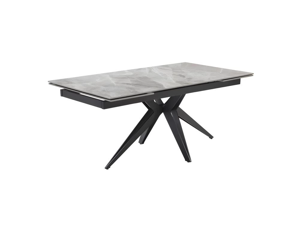 La table personnalisée adaptée à vos envies ! Son plateau en céramique Italienne pleine masse de 11mm gris marbré brillant est lumineux et robuste. Attablez jusqu’à 10 personnes grâce à ses 2 rallonges intégrées de 40 cm chacune, pratiques, et simple d’utilisation. Elle passe ainsi de 160 à 240 cm. Son plateau en céramique lui confère des qualités remarquables : résistance aux rayures, insensible aux taches diverses, et ne craint pas les différences de températures. Son piètement étoile ajouré en métal noir vous assure stabilité, robustesse et finesse !