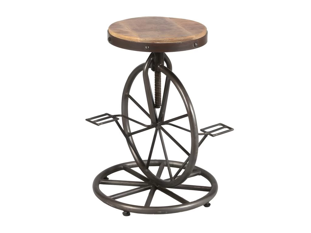 L’assise réalisée en bois massif propose une finition patinée cerclée de métal et réglable en hauteur grâce à une vis.